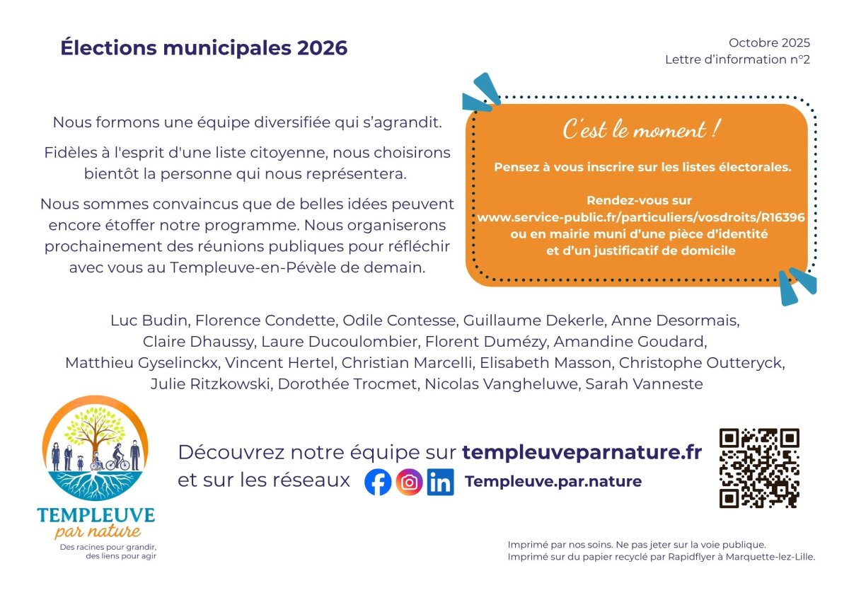 Nous sommes convaincus que des belles idées peuvent encore étoffer notre programme. Nous organiserons prochainement des réunions publiques pour réfléchir avec vous au Templeuve-en-Pévèle de demain !